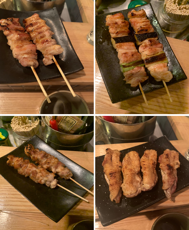 < 사진(왼쪽 상단부터 시계방향) ; 닭날개구이, 네기마(대파닭다리살구이). 난코츠(연골구이), 목살구이 >