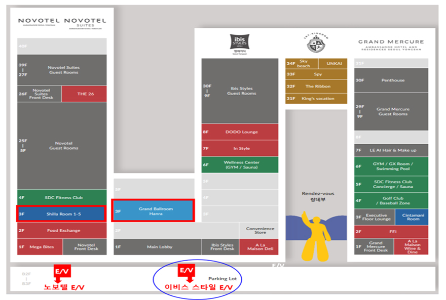 (연결통로 이용시 「노보텔」2층으로 연결되며, 엘리베이터를 이용하여 3층으로 올라오시기 바랍니다)