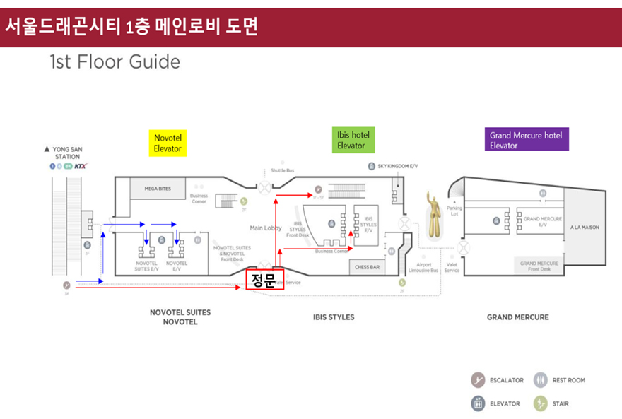 용산역 연결통로를 이용하여 노보텔 엘리베이터를 통해 오실 경우에는상기 도면을 참조하여 주시기 바랍니다.