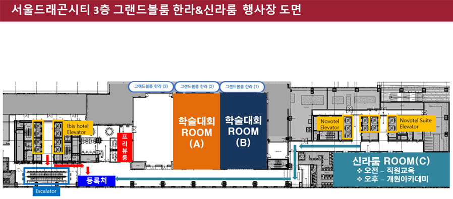 3층 그랜드볼룸 행사장은 [노보텔]과 [이비스 스타일] 사이에 위치하고 있으며등록처는 이비스 스타일방면(3층) 에스컬레이터 앞에 위치하고 있습니다. 명찰 및 초록집을 수령하신 후 학술대회장(그랜드 볼룸 한라)으로 이동하여 주시기 바랍니다.