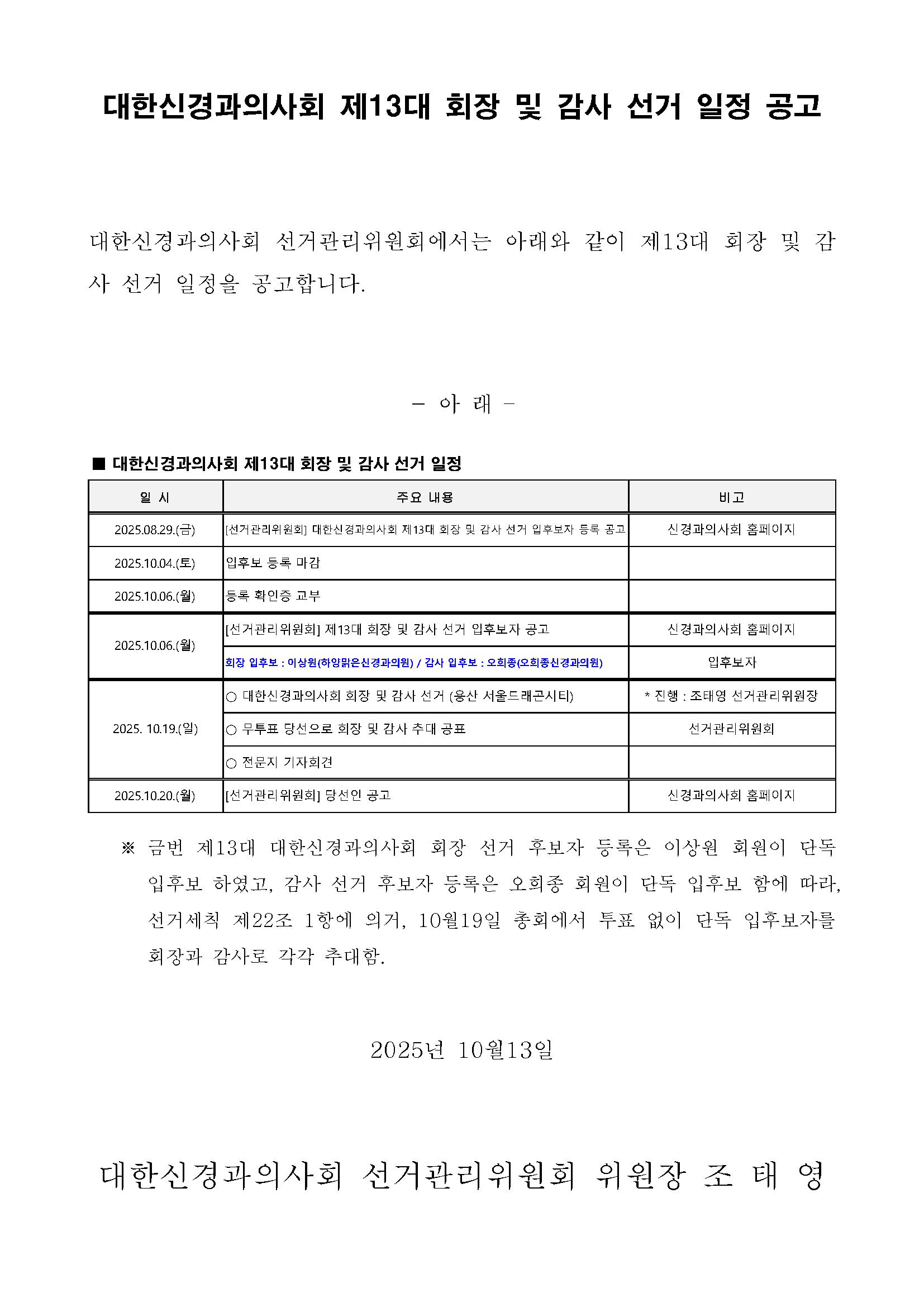 [대한신경과의사회 선거관리위원회] 대한신경과의사회 제13대 회장 및 감사 선거 일정 공고