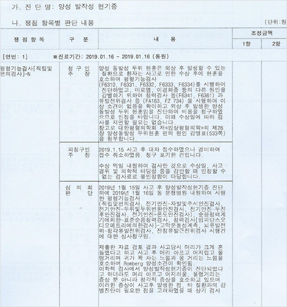 분쟁심의회는 자동차보험 진료수가기준에 따라 심사하여,<사진>에서와 같이 ‘이학적검사에서 양성발작성현기증이 진단되었다 하더라도 상기 검사 시행은 타당하므로 동 건은 인정함’이라 최종 결정하였습니다. 심사청구액은 전액 인정되었지만 심사비용으로 부담금 5만원이 들었습니다.