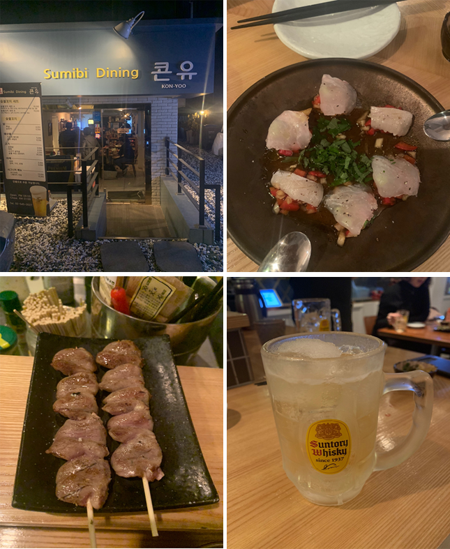 < 사진설명(왼쪽 상단부터 시계방향) : 가게전경, 광어카르파쵸, 닭염통구이, 하이볼 >