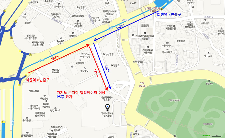 *밀레니엄 서울힐튼은 서울역(8번출구)과 회현역(4번출구) 사이에 위치하고 있으며, 도보 5분 거리에 위치하고 있습니다. 서울역 8번 출구나 회현역 4번 출구로 나오셔서 직진하시다 SK빌딩 옆 언덕길로 올라오시면 호텔 뒷편에 위치한 주차장이 있습니다.