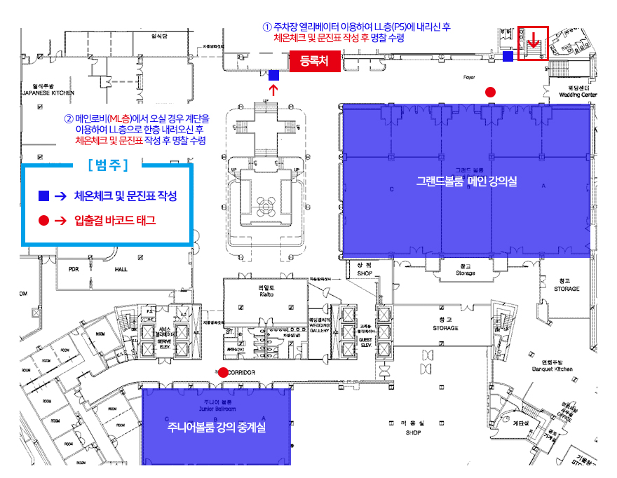 (카지노 주차장 엘리베이터를 이용하여 P5층(LL층)에서 내리신 후 그랜드볼룸으로 오시기 바랍니다)